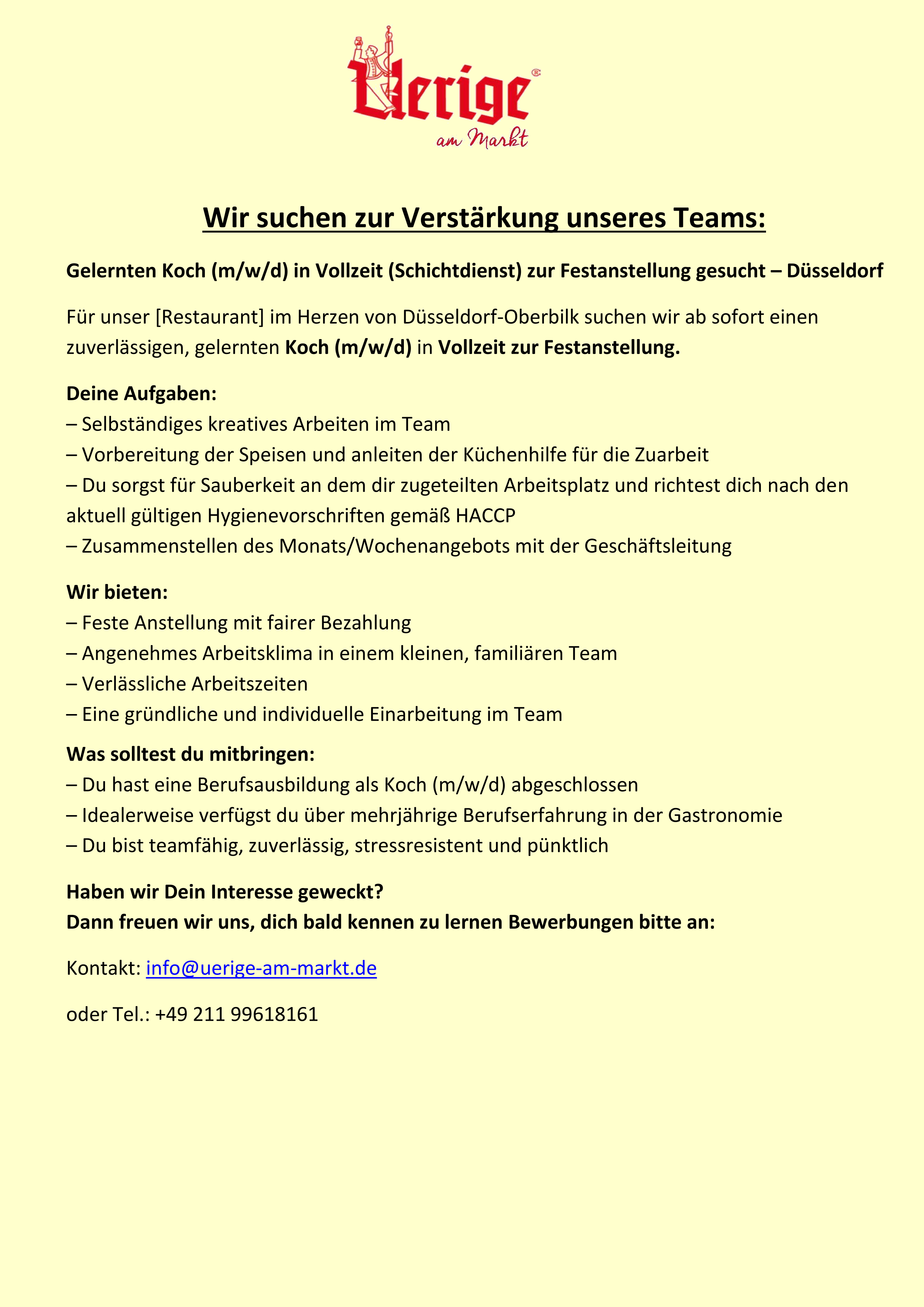 April 7, 2026 Uerige am Markt Wir suchen einen Koch m/w/d zur Verstärkung unseres Teams ab sofort April 7, 2026 Uerige am Markt Uerige am Markt